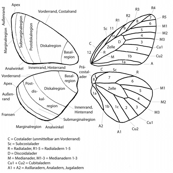 1. Benennung der Teilbereiche der Flügel und der Flügeladern bei Tagfaltern