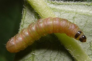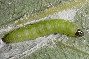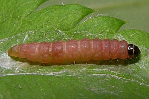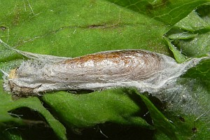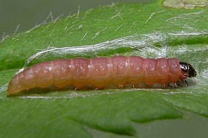 Schütze (1931: 99) führte die Art unter "Crataegus - Weißdorn, Hagedorn" an und zwar mit Hinweis "an Blättern". Er erläutert zur Raupe: "Zwischen filzig versponnenen Blättern von Crataegus, Pirus [Pyrus, Malus], Sorbus, Acer, Prunus spinosa usw. Verwandlung in der Wohnung oder zwischen Moos (Sorhagen); fast gesellig in zu einem großen Ballen versponnenen Sorbus-Blättern (Stange); zwischen versponnenen Trieben von Kern- und Steinobst (Disqué)." Schon zuvor hatte Schütze (1902: 19) zusammengetragen: "Gemein an Obstbäumen im Juni, Juli. Die Raupe lebt im Frühjahr auf Pyrus malus, Crataegus, Prunus spinosa, domestica, padus und Sorbus." Die phänologische Angabe zur Raupe umfasst dabei nur das letzte Raupenstadium im Frühjahr - tatsächlich schlüpft und frisst sie ja schon im Spätsommer und Herbst vor ihrer Überwinterung.