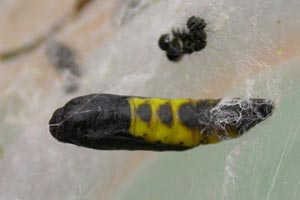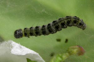 Uwe Büchner fiel allerdings eine Reihe aus kleinen schwarzen Punkte auf dem vorletzen Raupensegment auf, die so nicht bei den wenigen, von hinten fotografierten, Bildern von Y. cagnagella Raupen zu sehen ist. Ob das schon ein Unterscheidungsmerkmal ist, sollte durch mehrere dokumentierte Zuchten überprüft werden [Forum]. Im Gegensatz zu den gesellig in einem Gespinst lebenden Raupen von Y. cagnagella leben Y. irrorella Raupen einzeln in einem Gespinst [Uwe Büchner im Forum] und [ukmoth] (abgerufen 13. Juni 2020). Allerdings schreibt [SCHÜTZE], dass die Raupen von Y. irrorella vereinzelt mit denen von Y. cagnagella in einem Gespinst zusammenleben. Uwe Büchner vermutet: "Das wird so sein, wenn die Raupen von Y. cagnagella fast erwachsen sind und die Zweige großflächig eingesponnen haben."