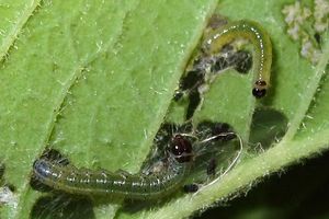 Von der Eiraupe bis zur größeren Raupe werden die Blätter miteinander versponnen. [Tina Schulz im Forum]