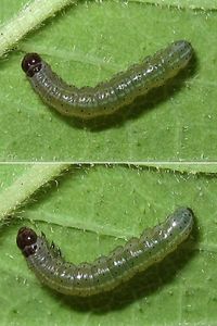 5-7: zwei Jungraupen (verschiedene Stadien), Deutschland, Niedersachsen, Landkreis Gifhorn, Leiferde, Brache am Stadrand, ca. 60 m, in versponnener Triebspitze von Beifuß (Artemisia vulgaris), 3. Juni 2013 (Fotos: Tina Schulz), det. Heidrun MelzerForum