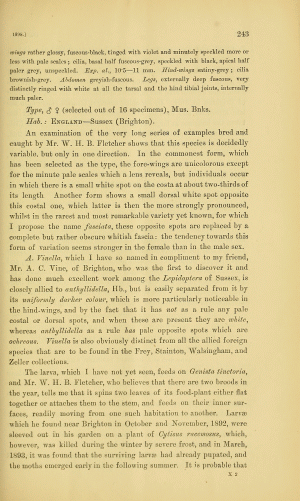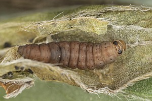Schütze (1931) schrieb: "An Genista tinctoria, lebt wie Anacampsis cincticulella [jetzt Syncopacma cincticulella] zuerst zwischen zusammen gesponnenen Spitzenblättchen, dann unter an den Triebstiel aufwärts angesponnenen Blättchen, welche sie aushöhlt, doch bei weitem nicht so gründlich wie jene. Verwandlung in der Wohnung. Raupen der Herbstgeneration können im Winter gesucht werden, da die angesponnene Blätterreihe nicht abfällt (Schütze)."