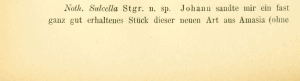 - Erstbeschreibung: Staudinger, O. (1879-1880 [159-368: 1879; 369-435: 1880]): Lepidopteren-Fauna Kleinasien's. — Horae societatis entomologicae rossicae 15: 159-435. St. Pétersbourg (V. Besobrasoff & Comp.).