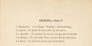 - Stainton, H. T. (1865): The natural history of the Tineina 9: [I-VII], 1-276, Gelechia pl. I-VIII. London (John van Voorst) – Paris (Deyrolle) – Berlin (E. S. Mittler und Sohn). — Digitalisat auf archive.org: [140-149], [pl. V fig. 1].