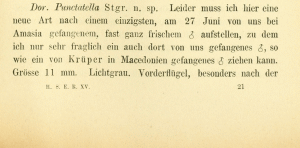 - Erstbeschreibung: Staudinger, O. (1879-1880 [159-368: 1879; 369-435: 1880]): Lepidopteren-Fauna Kleinasien's. — Horae societatis entomologicae rossicae 15: 159-435. St. Pétersbourg (V. Besobrasoff & Comp.).