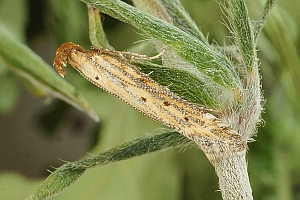 Schütze (1931: 204) hatte zur Raupe gemeldet: "Im Fruchtboden von Centaurea paniculata, Anthemis tinctoria in einem engen, kreisrunden Gange, der sich äußerlich nicht bemerkbar macht. Verwandlung im Frühjahr. Die bewohnten Köpfe trägt man am besten im Frühjahr ein (Sorhagen und andere). Südeuropa." mit ersterer Pflanze war sicher Centaurea stoebe gemeint - letztere dürfte falsch sein.