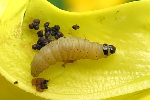 Schütze (1931) berichtet: "Raupe Mai bis Juni [...] In Blüten beziehungsweise Blütenknospen von Sarothamnus, Genista germanica, Ulex; die bewohnten Knospen zeigen ein kleines, rundes Bohrloch." Eine Quelle für Genista germanica fügt er leider nicht an, aber die Angabe scheint auf Sorhagen (1886: 187) zurückzugehen.