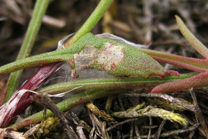 2: mit Sandkörnern belegter Verpuppungskokon im wurzelnahen Bereich von Kleinem Sauerampfer (Rumex acetosella): Deutschland, Sachsen, Noitzscher Heide bei Lindenhain, 2. Juni 2011 (det. & Freilandfoto: Heidrun Melzer)