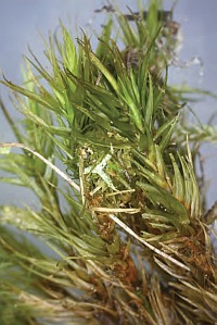 1: mit Sandkörnern belegte Wohnröhre der Raupe im wurzelnahen Bereich von Kleinem Sauerampfer (Rumex acetosella): Deutschland, Sachsen, Noitzscher Heide bei Lindenhain, 2. Juni 2011 (det. & Freilandfoto: Heidrun Melzer)