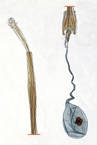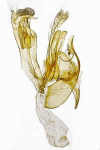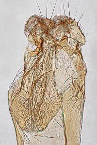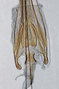 2-3: Genitalpräparat des als Diagnosebild 2 abgebildeten ♂, Deutschland, Baden-Württemberg, 78176 Blumberg, in einem nach Westen zum Wutachtal abfallenden locker bewaldeten Steilhang, 840 m, am Licht, 19. Juli 2016 (leg., gen. det., präp. & Foto: Hans-Peter Deuring), die gebogene Borste am Aedoeagus ist abgebrochenForum