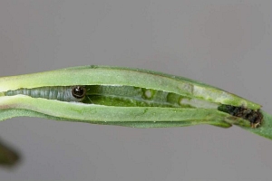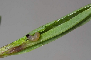 Huemer (1998) berichtete zu Gypsophila repens in den Hohen Tauern in Österreich: "Die Raupe miniert im Frühjahr ein Blättchen gangartig in Richtung Blattspitze, der Kotauswurf erfolgt an der Einbohrstelle. Anschließend verspinnt sie Blättchen eines Triebes zu einer spindelförmigen Wohnung und verhindert ein weiteres Sproßspitzenwachstum (Abb. 2). Innerhalb des versponnen Triebes erfolgt zuerst Schabe-, später Fensterfraß. Der Kot wird im apikalen Wohnungsbereich abgelegt. Erwachsen ist die Raupe ca. 6-7 mm lang, schmutzig gelblichgrün bis grün gefärbt, mit scharzem Kopf und Nackenschild. Sie verläßt schließlich die Wohnung durch ein apikolaterales Loch und verpuppt sich in einem schwachen Kokon am Boden bzw. zwischen abgestorbenen Stengeln. Die Puppe ist braun gefärbt. Zuchtexemplare schlüpften von Mitte Juni bis Ende Juli."