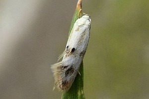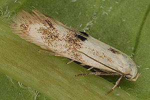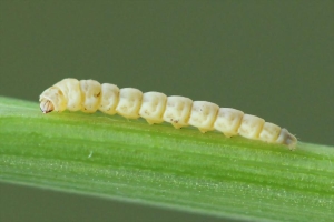 Schütze (1931) wusste zur Raupe an Schilf (Phragmites) zu berichten: "Die hell grünlichgelbe Raupe miniert in großen Plätzen gewöhnlich nahe an den Spitzen, Mine durch weiße Farbe auffallend, der Kot gegen das obere Ende hin angesammelt. Wechselt die Blätter (Stainton) Verwandlung meist an der Blattoberseite in der Nähe des Halms. Auch Phalaris arundinacea."