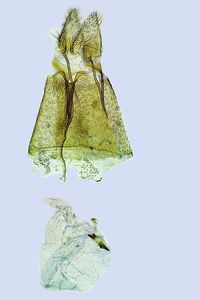6: Präparat des unter 4 abgebildeten ♀, Deutschland, Brandenburg, Eberswalde, Kleingarten nahe dem Forstbotanischen Garten, 20 m, 13. Mai 2018, Lichtfang (leg., präp., det. & fot.: Klaus Schwabe)Forum