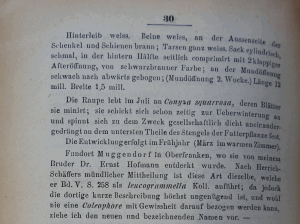 Hofmann (1877: 30) schreibt in seiner Erstbeschreibung zur Raupe: "Die Raupe lebt im Juli an Conyza squarrosa, deren Blätter sie minirt; sie schickt sich schon zeitig zur Ueberwinterung an und spinnt sich zu dem Zweck gesellschaftlich dicht aneinandergedrängt an dem untersten Theile des Stengels der Futterpflanze fest."