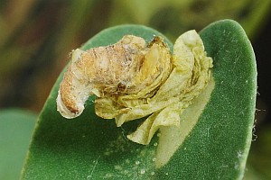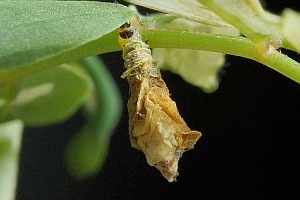 Die Raupen leben zu Beginn ihrer Entwicklung gesellig an verschiedenen Schmetterlingsblütlern, wie Hornklee (Lotus corniculatus), Wundklee (Anthyllis vulneraria), Hufeisenklee (Hippocrepis comosa), Süßholz-Tragant (= Süßer Tragant, Astragalus glycyphyllos) oder Bunter Kronwicke (Securigera (=Coronilla) varia). In Raupenbild 3 sind die unterseitigen Einstiegslöcher der Raupen ins Blattinnere sichtbar, wo dann die Substanz zwischen den Blattaussenhäuten gefressen wird. [Rudolf Bryner]
