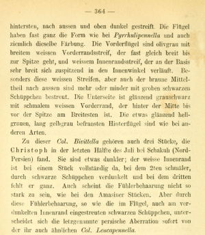 - Erstbeschreibung: Staudinger, O. (1879-1880 [159-368: 1879; 369-435: 1880]): Lepidopteren-Fauna Kleinasien's. — Horae societatis entomologicae rossicae 15: 159-435. St. Pétersbourg (V. Besobrasoff & Comp.).