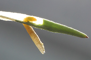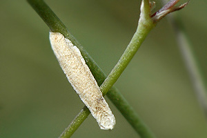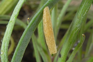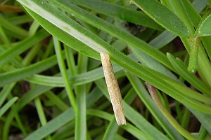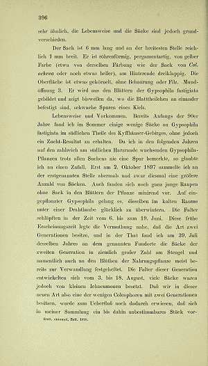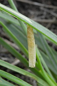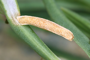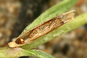 Die Raupensäcke wurden ausschließlich an Gipskraut-Arten (Gypsophila sp.) gefunden. In Mitteleuropa sind das Gypsophila fastigiata - so schon in der Erstbeschreibung von Petry (1898) detailliert geschildert - und Gypsophila repens (siehe auch Bilder oben). Budashkin & Puzanov (2011) berichten von der Ukraine (Krim) über den Fund von 20 Raupensäcken am 2. August 2010 an der osteuropäischen Gypsophila pallasii.