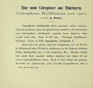 - Erstbeschreibung: Petry, A.: Eine neue Coleophore aus Thüringen, Coleophora Kyffhusana nov. spec. — Entomologische Zeitung 59: 394-398.