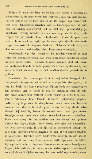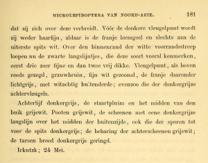 Snellen (1884: 179-181) beschrieb die Art nach einem einzigen Falter: „Een ♂, waaraan de linker spriet ontbreekt, doch dat overigens gaaf en frisch is, van 18 mm. vlugt. [...] Irkutzk ; 24 Mei.“