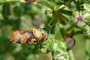 Schütze (1902: 27) meldete: "Den Sack fand ich im Herbst 1897 in grosser Menge in Kommerau an den Samen von Chenopodium." Schütze (1931: 86) formulierte dann später: "An den Samen von Chenopodium und Atriplex. Sack röhrenförmig, schwarz, runzelig, mit trockenen Blütenteilchen besetzt. Afterklappe sehe ich nicht, das Schwanzende ist abgerundet und vollständig geschlossen und aufwärts gebogen (Heinemann)."