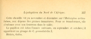 Chrétien (1915: 357) teilt mit: « Cette chenille vit en novembre et décembre sur l'Haloxylon articulatum, aus dépens des graines immatures. Pour se transformer, elle s'enforce avec son fourreau dans le sable. »