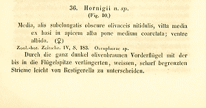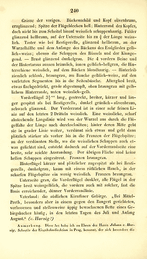 Zeller (1855: 240-241): „Diese Art habe ich zu Ehren des Herrn Johann v. Hornig, Sekretär der Eisenbahndirektion in Prag, benannt, der sich besonders die Erforschung der frühern Stände der Lepidopteren angelegen sein lässt und darüber in den Schriften des zoologisch-botanischen Vereins mehrere wichtige Aufsätze geliefert hat.“