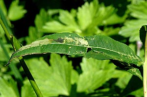 1-4: Minen an Epilobium angustifolium (Nr. 4 verlassen): Schweiz, Bern, Sonvillier, 940 m, montaner Nadelwald in Schattenhanglage, 11. August 2007 (det. und Fotos: Rudolf Bryner)