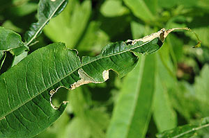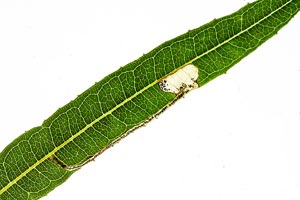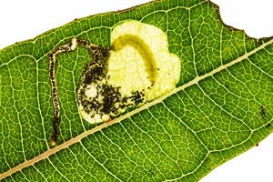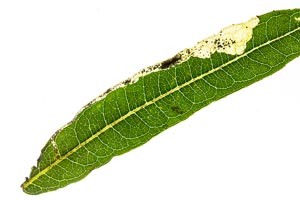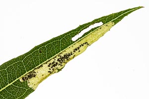 5-6: mit Raupe besetzte Mine an schmalblättrigem Weidenröschen Epilobium angustifolium: Deutschland, Sachsen, Noitzscher Heide bei Lindenhayn, 9. Oktober 2010 (leg., cult., det. & Freilandfotos: Heidrun Melzer)Forum