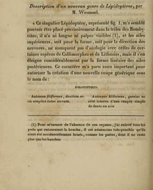 - Erstbeschreibung: Wesmael, [C.] (1836): Description d'un nouveau genre de Lépidoptères. — Bulletins de l'Académie royale des sciences et belles-lettres de Bruxelles 3: 162-163, pl. 6.