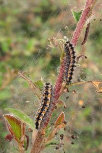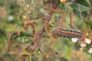1-3: Ausnahme: friedliche Fraßgemeinschaft mit Scythropia crataegella: Deutschland, Niedersachsen, Region Hannover, Seelze, 50 m, Hannoversche Straße, Einkaufsmeile nahe großflächigen Gleisanlagen, Raupen an Cotoneaster sp., Rubus sp. und Rosa sp. (Zwergmispel, Brombeere, Rose) auf 100 m Wegstrecke, 11. Mai 2024 (det. & Freilandfoto: Tina Schulz)Forum