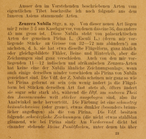 - Beschreibung als Zeuzera nubila: Staudinger, O. (1896): Beschreibung neuer Lepidopteren aus Tibet. — Deutsche Entomologische Zeitschrift Iris 8 (2): 300-343, pl. V-VI.