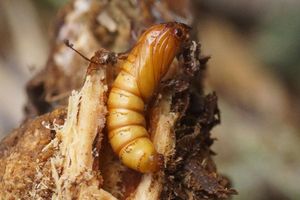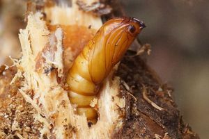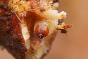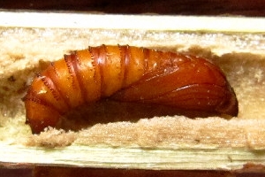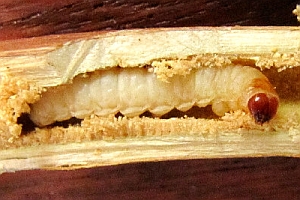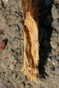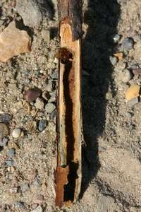 Ganz Ungeduldige können den Spross mit einem Messer öffnen, um nachzusehen, ob sich eine Puppe in ihm befindet. Oftmals trifft man jedoch auf Fraßgänge aus dem Vorjahr (siehe Bild oben).