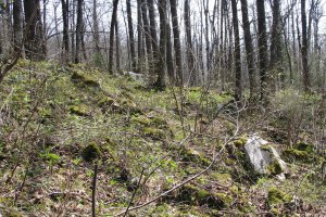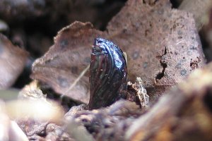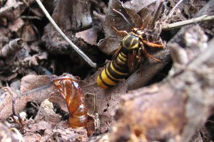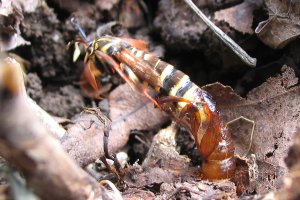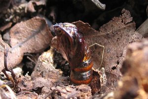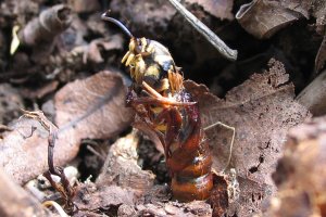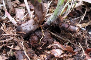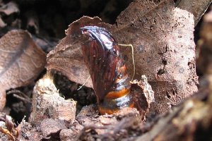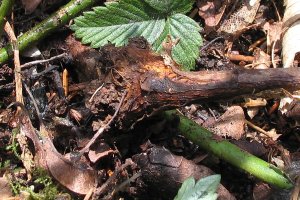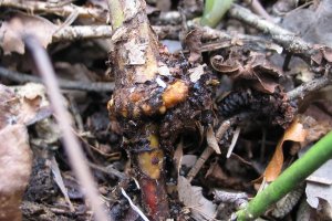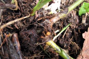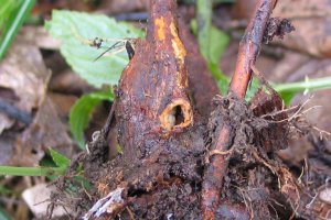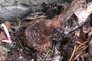 Die meisten Stielbasis-Schwellungen sind vollständig oder teilweise mit Falllaub bedeckt. Im Laufe ihrer Entwicklung werfen die Raupen Sägemehl in verschiedenen Korngrößen aus ihren Fraßgängen.