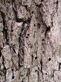 1-3: Griechenland, Larissa, Stomio, 0 m, 22. Mai 2015, [1]: Erlen-Allee, darunter ein besetzter Baum, [2] zahlreiche alte Ausschlupf-Löcher, [3] Ausschlupf-Löcher, entdeckt nach Abbürsten der Rinde (Fotos Theo Garrevoet)