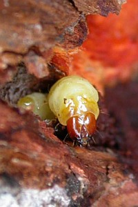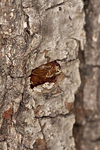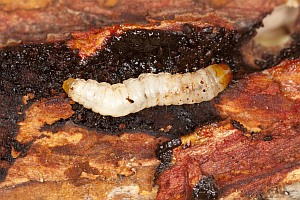 1-4: Griechenland, Larissa, Stomio, 0 m, leg. Raupe an Schwarzerle (Alnus glutinosa) 3. April 2006 [1-3] bzw. 22. Mai 2015; [1] in geöffnetem Kokon, [2] in fast ungeöffnetem Kokon nach Entferenen der obesten Rinde, wo das zukünftige Ausschlupfloch angelegt war, [3] ungeöffneter, weitgehend freigelegter Kokon, [4] Raupe im Fraßgang, typischerweise ausgekleidet mit feuchtem Kot und Genagsel (leg., cult., det. & Fotos Theo Garrevoet)