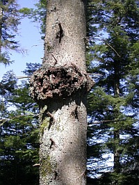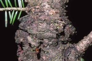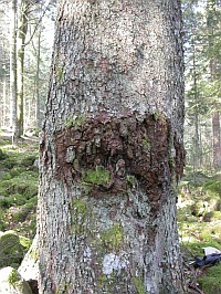 1: Weisstanne (Abies alba) mit ringförmiger Krebsgalle verursacht durch Rostpilz (Melampsorella caryophyllacearum): Schweiz, Bern, Tavannes, 800 m, feuchter Tannenwald in Nordhanglage, 5. Januar 2008 (Freilandaufnahme: Rudolf Bryner)Forum