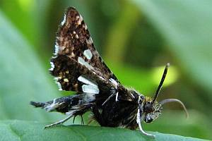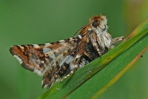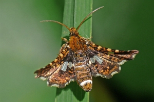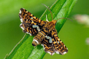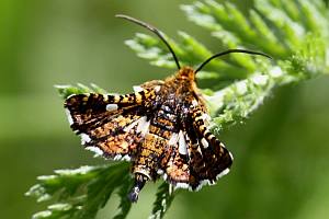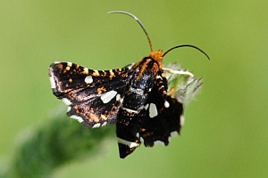 Die Raupe lebt in kleinen Blattrollen an Waldrebe (Clematis vitalba).