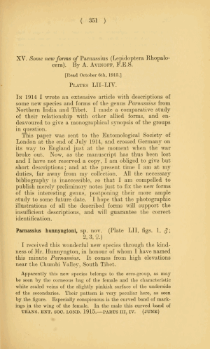 - Erstbeschreibung: Avinoff, A. (1916): Some new forms of Parnassius (Lepidoptera Rhopalocera). — The Transactions of the Entomological Society of London 1915 (3-4): 351-360, pl. LII-LIV.