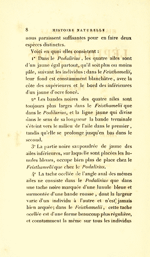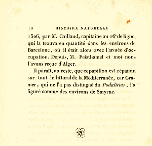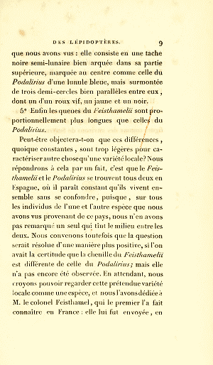 Die Jahreszahl 1526 auf S. 10 ist ein Druckfehler; die Falter wurden natürlich 1826 gesammelt. Auf der gleichen Seite glaubt Duponchel, den von Cramer (1775-1782) aus der Umgebung von Izmir / Smyrna abgebildeten podalirius zu feisthamelii ziehen zu müssen, eine Auffassung, die nach heutiger Kenntnis irrig ist.