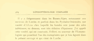 Konkret heißt es bei Oberthür (1910) zu Beginn von S. 404: "Il y a fréquemment dans les Basses-Alpes, notamment aux environs de Larche, et parfois dans les Pyrénées-Orientales, une variété d'Alveus chez laquelle les bandes ocre jaune des ailes inférieures, en dessous, sont très reduite d'épaisseur. J'ai appelé cette variété, qui est constante, Bellieri, en souvenir de l'Entomologiste qui possédait l'un des exemplaires que je fais figurer dans le présent ouvrage et qui vient de Larche."