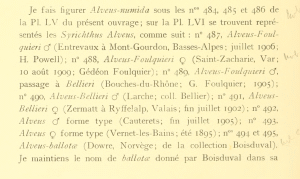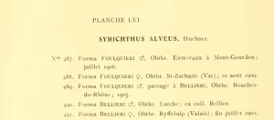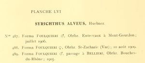 Weiter unten auf der Seite werden dann die Abbildungen mit Legenden angekündigt. S. 608 findet sich dann der dazu passende Text zur Tafel LVI; dort werden jetzt alle Taxa unter dem Dach Syrichtus alveus als "forma" bezeichnet, hier also "forma Bellieri" und "forma Foulquieri", wobei diesmal Foulquieri vor Bellieri dargestellt wird. Die beiden gezeichneten und handkolorierten Exemplare von "forma Bellieri" werden erläutert mit "490. Forma BELLIERI ♂, Obthr. Larche; ex coll. Bellier" und "491. Forma BELLIERI ♀ Obthr. Ryffelalp (Valais); fin juillet 1902". Letzteres wundert, wird die Art doch im Text nur von den französischen Alpen und den Pyrenäen erwähnt, nicht aber vom Wallis - da die Art in der Schweiz nie mehr gefunden wurde, ist davon auszugehen, dass hier die Bestimmung oder aber der Fundort unzutreffend sind. Die drei Exemplare von "forma FOULQUIERI" tragen die Bezeichnungen: "487. Forma FOULQUIERI ♂, Obthr. Entrevaux à Mont-Gourdon; juillet 1906", "488. Forma FOULQUIERI ♀ Obthr. St. Zacharie (Var); 10 août 1909" und "489. Forma FOULQUIERI ♂, passage à BELLIERI Obthr. Bouches-du-Rhône; 1905".