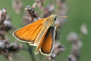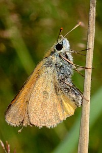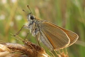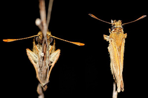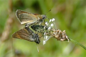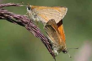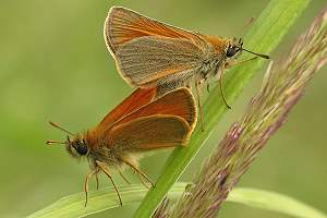 Sonderegger (1997: 87-88) unterscheidet für die Schweiz zwischen Eiablage-Beobachtungen und Raupenfunden: "Die Eiablage wurde im Jura an Knäuelgras (Dactylis glomerata) und am Gemeinen Kammgras (Cynosurus cristatus) und im Wallis auf 2100 m an Alpenlieschgras (Phleum alpinum) und in der subalpinen Stufe an Wiesenfuchsschwanz (Alopecurus pratensis) beobachtet." Die Eiablage wurde vielfach beschrieben, so auch hier: "Das Weibchen fliegt knapp unterhalb der Ähre an den Grashalm und klettert diesem entlang nach unten, bis die geeignete Eiablagestelle gefunden ist. Wird während des Herunterkletterns der Grashalm von einem anderen Pflanzenteil tangiert, verlässt das Weibchen die Pflanze und sucht sich eine neue Ablagepflanze. Es werden zwei bis vier Eier in einen Spalt gezwängt, der durch ein Grasblatt und den Grasstengel gebildet wird. In den allermeisten Fällen sind die Eier schon nach wenigen Stunden nicht mehr sichtbar, da der Spalt an der Eiablagestelle durch das Wachstum des Blattes geschlossen wird." Was in dieser Beschreibung fehlt, ist, dass das Weibchen bei der Eiablage den Halm im Rückwärtsgang, also mit dem Kopf nach oben, den Halm hinuntergleitet, es die richtige Eiablagestelle also quasi mit dem Hinterleib ertastet. Wer sich ein bisschen mit Gräsern beschäftigt, wird rasch erfahren, dass sich die Grasarten in Bezug auf die Ausbildung dieser Blattscheiden am Halm stark unterscheiden - schon von daher ist von einer unterschiiedlichen Nutzung auszugehen. Sonderegger (1997: 87-88) schreibt weiter: "Thymelicus sylvestris legt die Eier immer an grüne Gräser, im Gegensatz zu Thymelicus lineola und acteon, die immer dürre Grasteile belegen." Dass das "immer" so nicht zutrifft, zeigt obiges Eiablagefoto von Josef Bücker aus Hagen-Dahl, wo T. sylvestris auch einmal an ein trockenes Gras (hier Dactylis glomerata) ablegt. Als Regel ist diese Unterscheidung aber gut belegt.