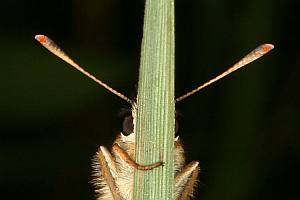 Maes & van Dyck (1999: 170) behaupten zu den Niederlanden: "De wijfjes zetten de eitjes in rijen van ongeveer acht an de binnenzijde van een blad van bloeiende grassen van het geslacht Witbol, Vossestaart, Struisriet, Doddengras, Zwenkgras, Kweekgras, en Pijpenstrootje." [Holcus, Alopecurus, Calamagrostis, Phleum, Brachypodium, Phleum und Molinia]. So formuliert ist das - zumindest was Molinia betrifft, eindeutig falsch.