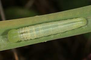 Carter (1982: 30) schrieb zur Raupe: "It feeds in spring on various grasses such as false-brome (Brachypodium) and Yorkshire fog (Holcus lanatus)".