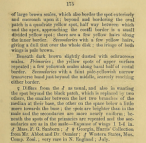 - Nomen novum: Scudder, S. H. (1863): A List of the Butterflies of New England. — Proceedings of the Essex Institute 3: 161-179.