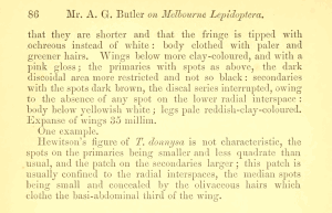 - Original description: Butler, A. G. (1882): On a small Collection of Lepidoptera from Melbourne. — The Annals and Magazine of Natural History, Including Zoology, Botany, and Geology. Fifth Series 9: 84-103.
