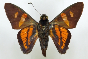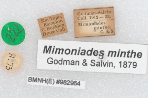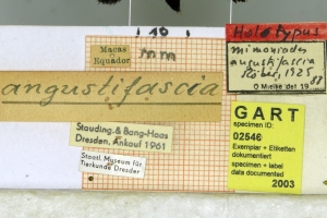 13-15: Holotypus ♂ von Mimoniades angustifascia, Daten siehe Etiketten (fot.: Ernst Brockmann, Fotos bearbeitet: Michel Kettner), coll. Senckenberg Museum für Tierkunde, Dresden.