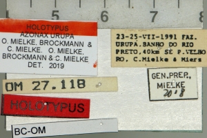 1-3: ♂ Holotypus, Daten siehe Etiketten (fot.: Carlos Mielke, Fotos bearbeitet: Michel Kettner), det. Olaf Mielke, Ernst Brockmann & Carlos Mielke, coll. Departamento de Zoologia, Universidade Federal do Paraná, Curitiba, Paraná, Brazil.