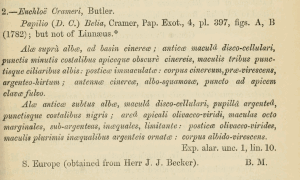 Balletto et al. (2020: 391) teilen mit: “Rothschild, although wrongly supposing that Butler’s name was based on a single specimen, can be deemed as having designated one of the NHMUK specimens from “Spain” as the lectotype, under Art. 74.6 (ICZN 1999).”