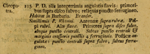 Honey & Scoble (2001: 312): “LSL [The Linnean Society of London, Anm. Red. Lepiforum]: 1 ♂, without head, abdomen, or left hindwing, labelled “Cleopatra” [by Linnaeus], “Cleopatra 765” [by Smith], here designated as LECTOTYPE; [...].”